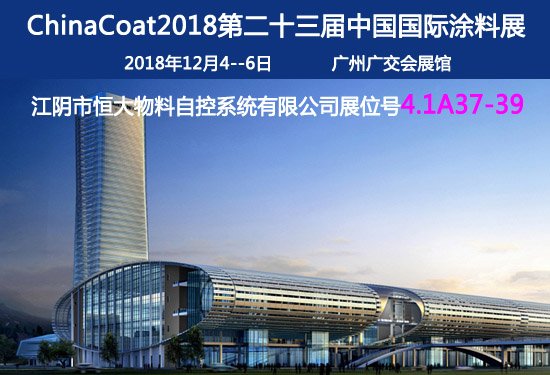 ChinaCoat2018第二十三屆中國(guó)國(guó)際涂料展將于2018年12月4--6日在廣州廣交會(huì)展館舉行。粉體自控解決方案供應(yīng)商--江陰市恒大物料自控系統(tǒng)有限公司 將攜大容量脈沖氣流混合機(jī)等產(chǎn)品亮相盛會(huì),在4.1A37-39展位等您。