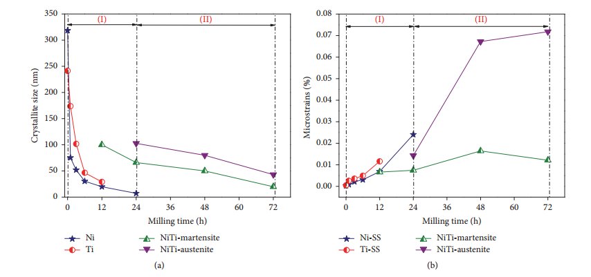 b:研磨時間能增加內應力,增加的原因可能是因為包括幾種塑性變形相的位移濃度增加。NiTi馬氏體在48h增加到0.9%又減少,表明晶體大小達到了一個固定的值。