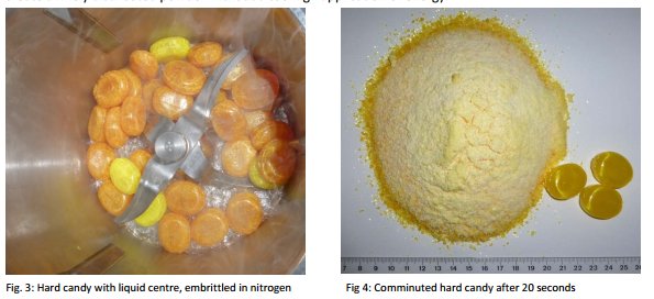 按強制規定,為檢測水果味糖果中的維生素和其他添加劑,破碎等前處理后進行高效液相色譜分析,色譜分析的檢測用量一般都只需要毫克級,這就需要進行充分的均質,這對含糖量高的樣品來說,充分分散均質比較困難。由于高含糖和維生素,需要研磨前液氮冷凍使其變硬脆,并保持維生素在低溫下的穩定。