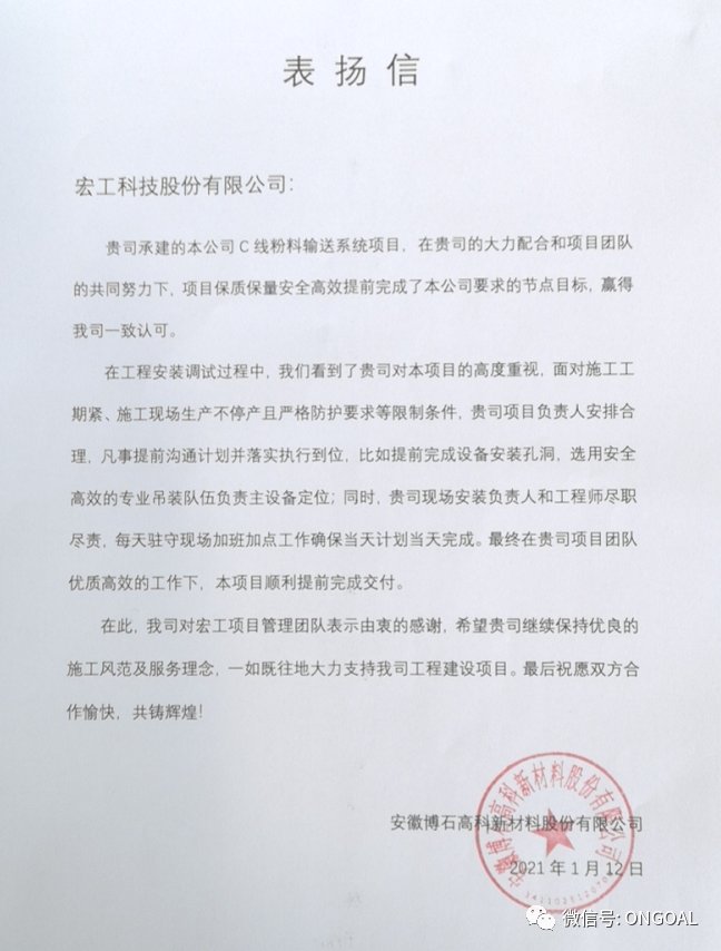 1月12日,安徽博石高科新材料股份有限公司(以下簡稱:博石高科)的C線粉料輸送項目確認(rèn)保質(zhì)保量圓滿完成,并得到了博石高科專門發(fā)函對宏工及項目施工管理團(tuán)隊提出表揚(yáng)。