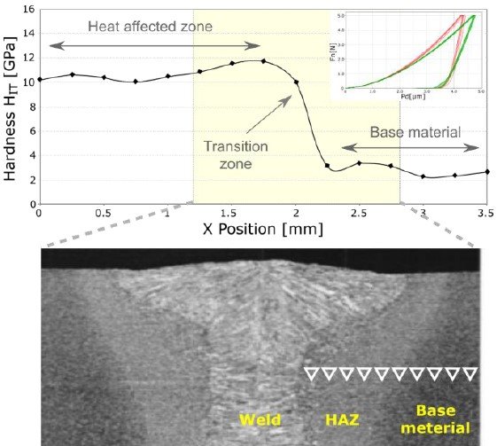 焊縫和熱影響區(qū)的典型尺寸通常為數(shù)百微米至幾毫米。為了研究由于焊接過程引起的局部材料變化,儀器化壓痕測試方法是首選,因?yàn)樗鼈兲峁┝撕线m的位移分辨率。例如,安東帕微觀組合測試儀(MCT3)可以獲取焊縫或熱影響區(qū)等等不同區(qū)域的硬度、彈性模量等力學(xué)性能。磨損量和摩擦性能可以很容易地通過摩擦磨損分析儀來測量,該分析儀測量摩擦系數(shù)并可用于估計(jì)磨損率。