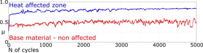 圖2: 熱影響區(qū)和母材的摩擦系數(shù)變化情況