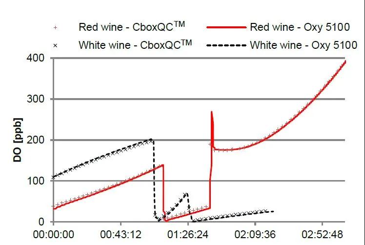 圖 2 顯示了在不同的 CO2 濃度下,含氣葡萄酒的工藝和實驗室數據相關性。在使用 N2 脫氣的過程中,Carbo 5100 與實驗室參考值 (CboxQCTM) 之間的偏差(< 11:45 的時候)是由于溶解 N2 含量相對較高造成的。實驗室參考值和 Carbo 6300 的測量方法均不受溶解外來氣體(如 O2 和 N2)的影響。圖 3 顯示了紅葡萄酒和白葡萄酒中 DO 的工藝和實驗室數據相關性。
