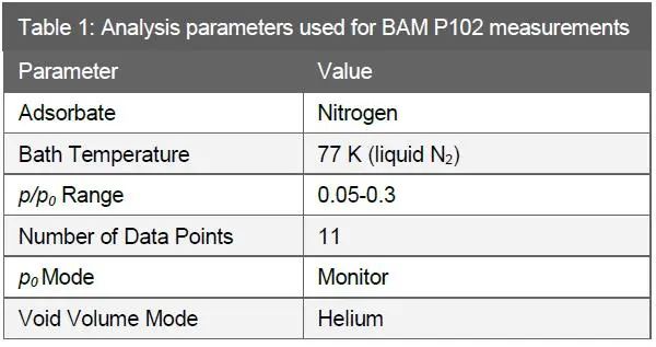 在測(cè)量BET比表面積時(shí),樣品的總表面積(m2)是獲得準(zhǔn)確和可重復(fù)性結(jié)果的關(guān)鍵。必須有足夠的面積使氮?dú)馕剑援a(chǎn)生儀器能夠準(zhǔn)確檢測(cè)到的壓力變化。使用標(biāo)準(zhǔn)樣品BAM P102在安東帕Nova 800(長(zhǎng)樣品管)和Nova 600 BET(短樣品管)上進(jìn)行總表面積(m2)和重復(fù)性之間的相關(guān)性研究。在這兩種儀器上,都使用了帶有填充棒的9毫米大球泡樣品管。表1給出了用于測(cè)量的分析參數(shù)。