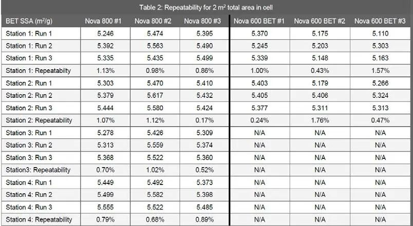 3臺(tái)Nova 800和3臺(tái)Nova 600 BET儀器的結(jié)果如表2所示。所有測(cè)試結(jié)果都符合BAM P102要求。結(jié)果發(fā)現(xiàn),在所有6臺(tái)儀器上,樣品管的總表面積為2 m2時(shí),重復(fù)性< 2%。對(duì)同一類型的不同儀器上的測(cè)試結(jié)果進(jìn)行重現(xiàn)性計(jì)算,Nova 800和Nova 600 BET的重現(xiàn)性分別為1.77%和1.84%。