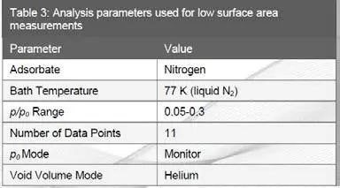 BET 比表面積(m2/g)是材料的一項(xiàng)重要性質(zhì)。根據(jù)孔隙度、顆粒大小和顆粒形狀,材料可以具有非常低的比表面積。在Nova 800(長(zhǎng)樣品管)和Nova 600 BET (短樣品管)上,儀器可靠地測(cè)量了比表面積的下限和重復(fù)性。所有測(cè)試都使用了9 mm 的球形管和填充棒。表3 給出了實(shí)驗(yàn)中使用的分析參數(shù)。由于在此范圍內(nèi)沒(méi)有標(biāo)準(zhǔn)樣品,通過(guò)將BCR-169(比表面積為0.10 m2/g) 與銅珠混合(稀釋),得到表面積約為0.01 m2/g 的樣品。