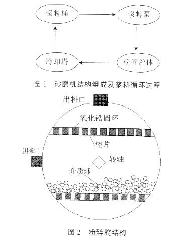 砂磨機的結構一般由4 部分組成, 如圖1 所示,有漿料桶、漿料泵、粉碎腔及轉動系統、冷卻系統。一定粘度的漿料在泵作用下。進入粉碎腔( 粉碎腔結構見圖2) , 與高速轉動( 轉速1 600~2 200 r/min) 的介質球接觸, 粉料顆粒受到介質球的沖擊碰撞和研磨而碎裂。同時, 在轉子的帶動下, 漿料隨介質球一起高速滾動, 顆粒受到流體剪切力的作用而碎裂。從粉碎腔內流出的漿料經冷卻塔回到漿料桶, 再次重復前述粉碎過程。砂磨機粉碎是個循環粉碎作業過程,顆粒在不斷的沖擊碰撞和剪切力作用下實現粉碎,得到的顆粒粒度細且粒徑分布窄。