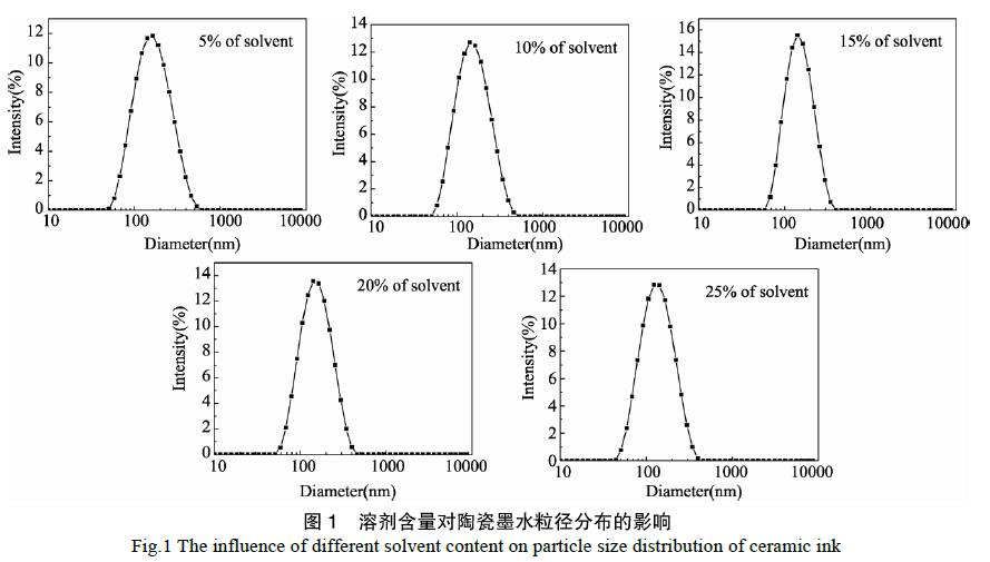 以Cu-Cr-O 陶瓷色料為著色劑,以丙二醇、二乙二醇作為溶劑,添加分散劑、消泡劑等其它助劑進行均勻混合。實驗一:按溶劑含量為5%、10%、15%、20%、25%五個不同比例進行配比,將配好的溶液放入分散機中進行分散;分散后的漿料移入砂磨機中進行研磨,***通過過濾裝置進行過濾,所得濾液即為水性黑色陶瓷墨水;實驗二:在確定***溶劑含量的條件下,添加不同生產廠家的分散劑,進行分散、研磨、過濾等一系列相同的操作,得到水性黑色陶瓷墨水。