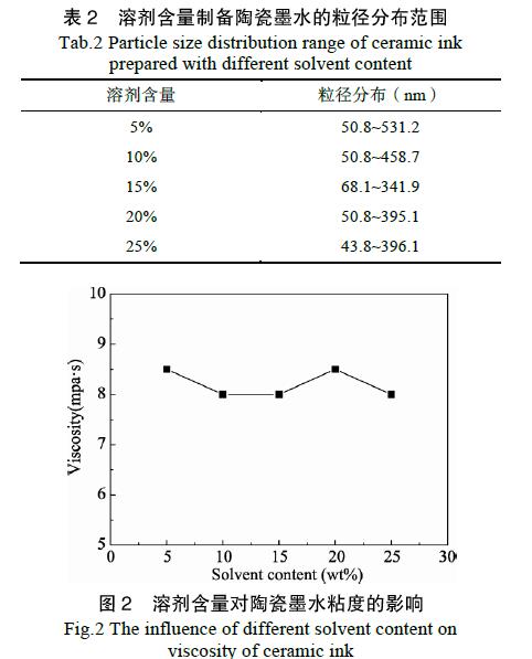 綜上所述,根據已查文獻資料數據,從溶劑的溶解性、表面張力、粘度等因素考慮,選擇丙二醇和二乙二醇作為制備水性陶瓷墨水的主要溶劑。其他條件固定不變的情況下,考察不同溶劑含量對陶瓷墨水粒度的影響,如圖1 所示。