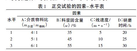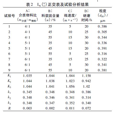 取氧化鋯原始粉,分別采用臥式砂磨機(jī)、立式珠磨機(jī)和立式球磨機(jī),以2mm的氧化鋯球作為研磨介質(zhì)( m介質(zhì)∶ m物料= 5∶ 1) ,以純水作為分散介質(zhì)( 料漿固含量( w) 為45%) ,研磨15 h 后,采用Bettersize2000 智能激光粒度儀檢測(cè)研磨后料漿的粒度分布,以確定***研磨設(shè)備。選擇***研磨設(shè)備,以2 mm 的氧化鋯球作為研磨介質(zhì),選擇介質(zhì)物料比、料漿固含量、線速度和研磨時(shí)間作為試驗(yàn)因素,并各取3 個(gè)水平,選擇L9( 34 )正交表進(jìn)行正交試驗(yàn)。因素-水平表見表1。