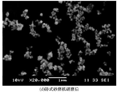 由可知: 氧化鋯原始粉料團(tuán)聚比較嚴(yán)重,粒徑較大; 采用立式球磨機(jī)研磨后團(tuán)聚程度有所減輕,但粒度變化不明顯,研磨效果不佳; 用立式珠磨機(jī)研磨后氧化鋯粉的部分團(tuán)聚被打開,且粒度顯著減小;采用臥式砂磨機(jī)研磨后氧化鋯粉的大部分團(tuán)聚被打開,粒度***小,研磨效果***。