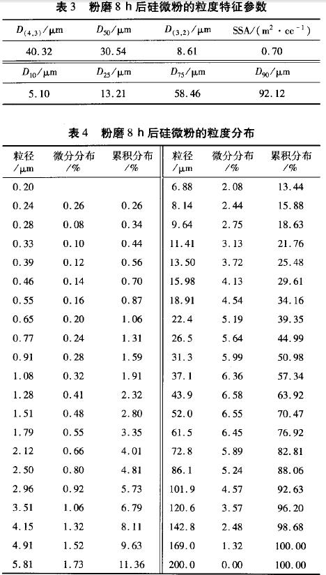 是30.54 ixm。由表4可以看出,粉磨8 h后硅微粉的粒徑為43.9 m時微分分布***,為6.58% ;***粒徑169.0 m,對應的微分分布為1.32%。
