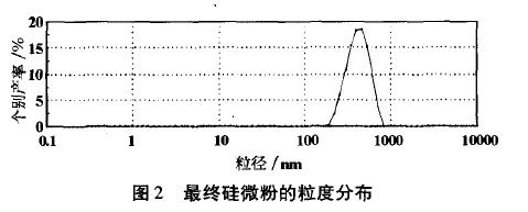 由表8可以得知,在粉磨12 h后,物料粒度在1m左右以下的僅占11.65% ,故要通過沉降分級才能獲取1 I.Lm以下的石英粉體。若要增加1 txm以下的石英粉體產量,還需繼續延長攪拌研磨時問。將粉磨12 h后的石英粉在1 000 mL的量筒中進行自由沉降分級,沉降時間為14 h,之后設法收集量筒中懸浮液中的硅微粉,將此硅微粉用納米粒度與Zeta電位分析儀測定其粒度,粒度微分分布示于圖2。從圖2可以看出,用攪拌磨粉磨后再經分級可以制得小于1 Ixm的石英粉,可滿足高科技行業對原料粒度的要求。儀器分析測得粉末的平均粒徑為624.7 nm。