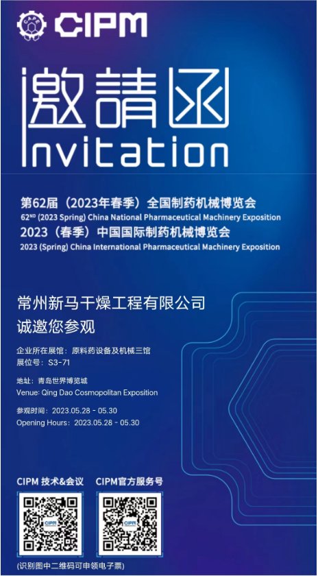 第62屆(2023年春季)全國制藥機械博覽會暨2023(春季)中國國際制藥機械博覽會將于2023年5月28至30日在青島世界博覽城展館拉開序幕。屆時,常州新馬干燥工程有限公司將在原料藥設備及機械3館S3-71恭候大駕,期待您的光臨!