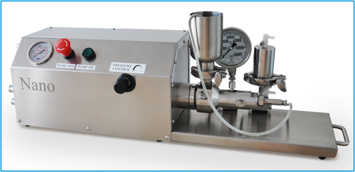 微射流均質(zhì)機(jī)利用幾十到幾百微米左右噴嘴形成超音速射流,進(jìn)行相互對(duì)撞和極強(qiáng)烈的剪切,在較高的均質(zhì)壓力, 產(chǎn)生較好的粒徑分布效果。優(yōu)點(diǎn)是高壓條件下可以連續(xù)化作業(yè)。