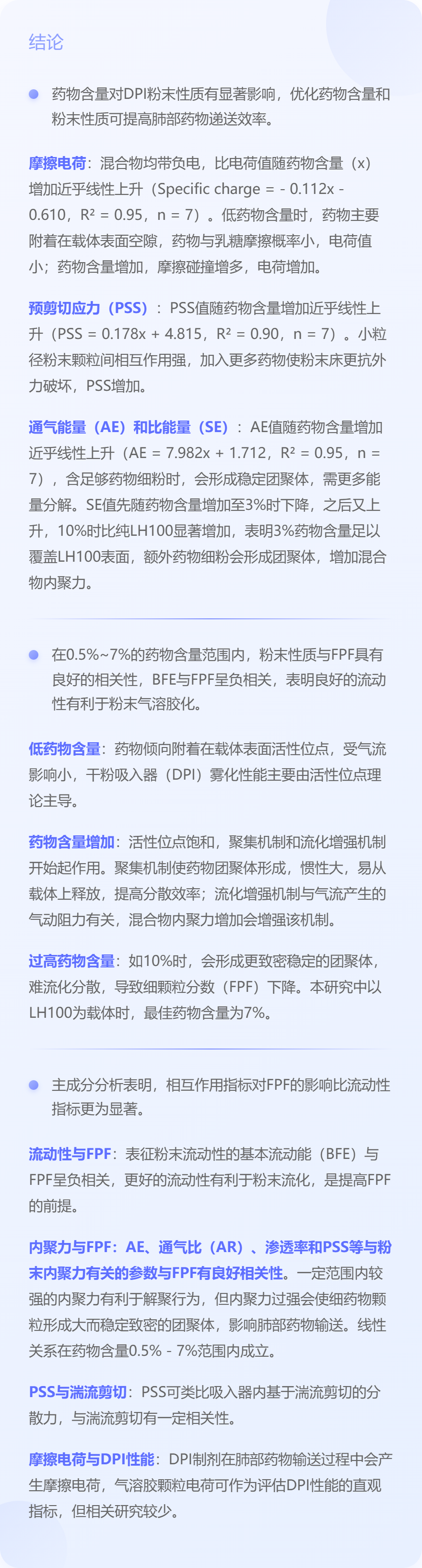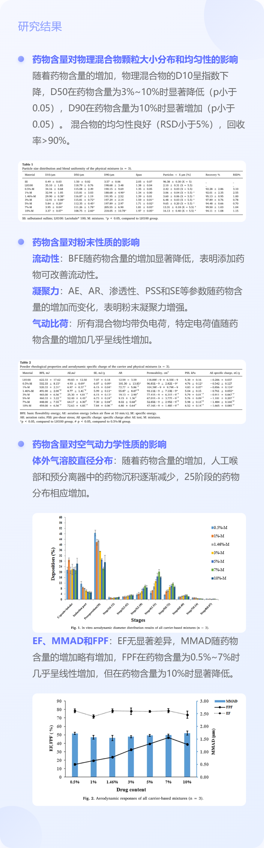 [1] Sun Y ,Qin L ,Liu C , et al. Exploring the influence of drug content on DPI powder properties and potential prediction of pulmonary drug deposition [J]. International Journal of Pharmaceutics, 2020, 575 119000.
