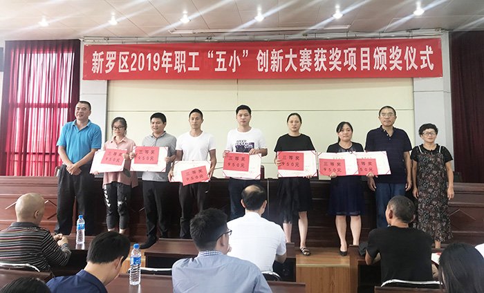 2019年10月14日,龍巖市新羅區(qū)2019年職工“五小”創(chuàng)新大賽獲獎(jiǎng)項(xiàng)目頒獎(jiǎng)儀式上,龍巖市山和機(jī)械制造有限公司的一種納米鈣解聚工藝及裝置項(xiàng)目、高效排渣的干式粉碎盤項(xiàng)目同時(shí)斬獲三等獎(jiǎng)。我司辦公室張主任出席并登臺(tái)領(lǐng)獎(jiǎng)。