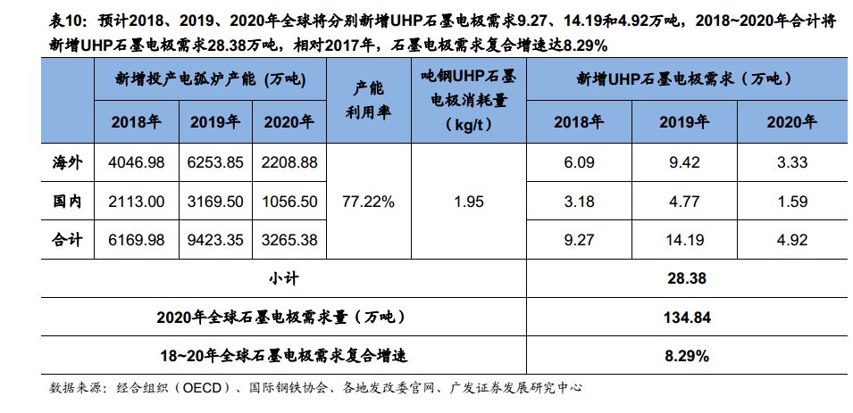 根據(jù)以上假設(shè)條件,我們預(yù)計(jì)2018、2019、2020年全球或?qū)⒎謩e新增UHP石墨電極需求9.27、14.19和4.92萬噸,2018~2020年合計(jì)或?qū)⑿略鯱HP石墨電極需求28.38萬噸,即到2020年全球石墨電極總需求量將達(dá)134.84萬噸,18~20年全球石墨電極需求復(fù)合增速達(dá)4.88%。