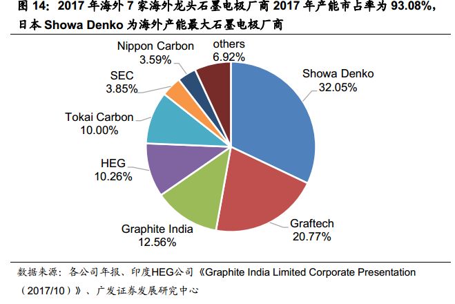 2017年7家海外龍頭石墨電極廠商產(chǎn)能市占率為93.08%,日本Showa Denko為海外產(chǎn)能最大石墨電極廠商。根據(jù)印度石墨電極巨頭Graphite IndiaLimited于2017年10月發(fā)布的《Graphite India Limited Corporate Presentation(2017/10)》,2017年海外主要石墨電極生產(chǎn)企業(yè)產(chǎn)能情況為:日本Showa Denko、美國Graftech、印度Graphite India、HEG、日本Tokai Carbon、SEC和Nippon Carbon2017年產(chǎn)能分別約為25萬噸、16.2萬噸、9.8萬噸、8.0萬噸、7.8萬噸、3.0萬噸和2.8萬噸,合計(jì)72.6萬噸;根據(jù)Showa Denko于2017年12月12日發(fā)布的《Medium-term BusinessPlan "Project 2020+" Progress in 2017;Tasks and Strategies for 2018》報(bào)告,Showa Denko公司預(yù)計(jì)2017年全球(除中國外)石墨電極產(chǎn)能為78萬噸,即7家海外龍頭石墨電極廠商2017年產(chǎn)能市占率為93.08%。