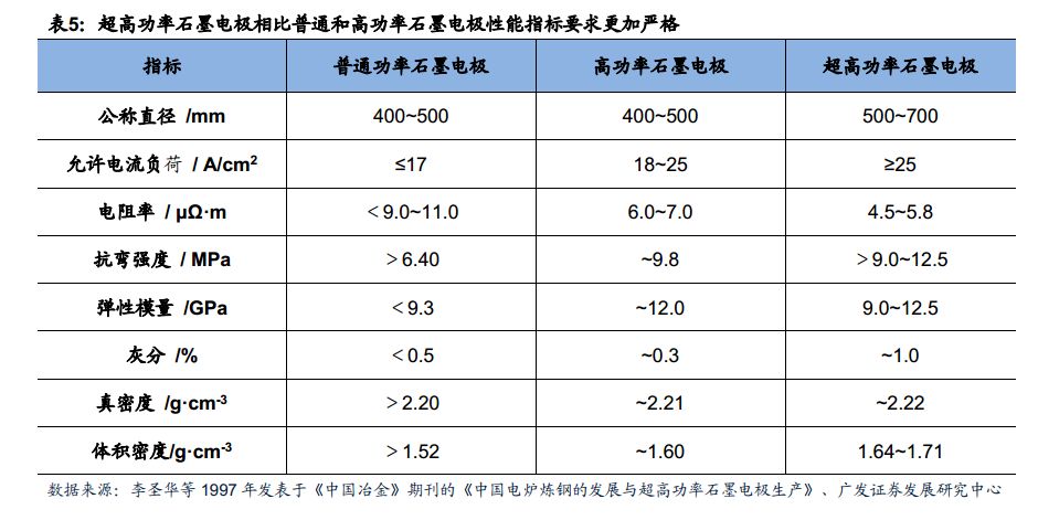 石墨電極高功率化趨勢(shì)對(duì)石墨電極的性能提出了更高的要求。普通功率石墨電極允許使用電流密度低于17A/cm2,主要用于煉鋼、煉硅、煉黃磷等普通功率電弧爐;高功率石墨電極允許使用的電流密度為18~25A/cm2,主要用于煉鋼的高功率電弧爐;超高功率石墨電極允許使用的電流密度大于25A/cm2,主要用于煉鋼的超高功率電弧爐。普通功率、高功率及超高功率石墨電極在直徑、電阻率、抗彎強(qiáng)度、抗拉強(qiáng)度、彈性模量、灰分等物理、化學(xué)性能參數(shù)上也有差異。超高功率石墨電極的各項(xiàng)物化性能較普通功率、高功率石墨電極更為優(yōu)異,產(chǎn)品定位也更加高端。