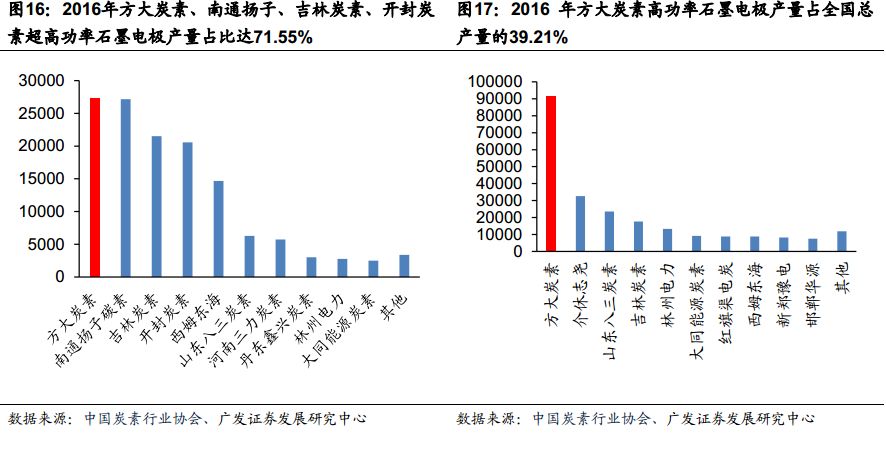 方大炭素石墨電極市占率全國第一,2016年產(chǎn)量占比超28%。根據(jù)中國炭素行業(yè)協(xié)會(huì)發(fā)布的2016年我國炭素行業(yè)運(yùn)行情況和方大炭素201年年報(bào),2016年方大炭素石墨電極產(chǎn)量達(dá)14.2萬噸,占2016年全國石墨電極總產(chǎn)量的28.17%,市場(chǎng)占有率居全國首位。從超高功率石墨電極看,CR4達(dá)71.55%,方大炭素產(chǎn)量居首:根據(jù)中國炭素行業(yè)協(xié)會(huì)發(fā)布的2016年我國炭素行業(yè)運(yùn)行情況,2016年我國超高功率石墨電極產(chǎn)量13.49萬噸,同比2015年下降17.47%,其中方大炭素、南通揚(yáng)子炭素、吉林炭素、開封炭素四家企業(yè)產(chǎn)量排名居前,其超高功率石墨電極產(chǎn)量占全國總產(chǎn)量比例高達(dá)71.55%。