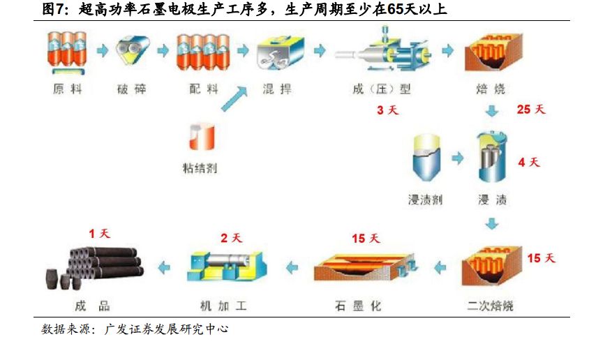 2、生產(chǎn)工序與周期:生產(chǎn)工序達(dá)11道,普通功率石墨電極生產(chǎn)周期超50天,超高功率長(zhǎng)達(dá)65天