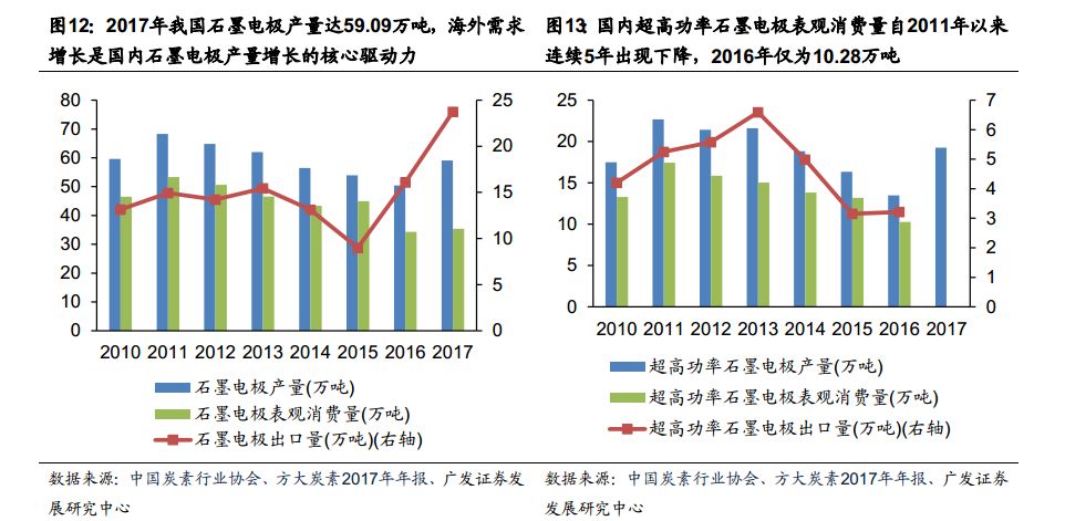 1、國內(nèi):2017年國內(nèi)石墨電極表觀消費(fèi)量35.36萬噸,同比僅小幅增長(zhǎng)3.06%,占全球石墨電極需求總量的32.23%