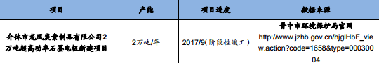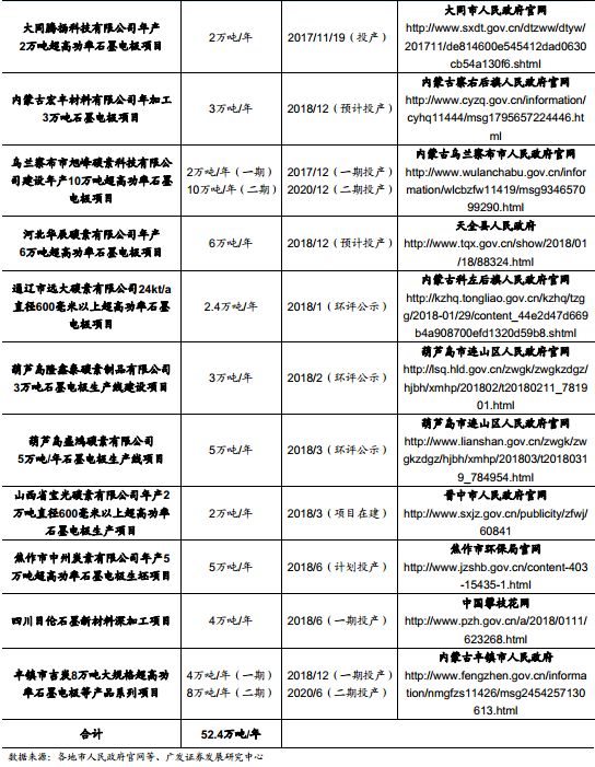 2017年來國內(nèi)投產(chǎn)、在建、擬建的石墨電極項(xiàng)目總產(chǎn)能至少為52.4萬噸,其中6萬噸超高功率石墨電極產(chǎn)能已投產(chǎn)。我們統(tǒng)計(jì)了2017年以來全國各地市投產(chǎn)、在建、擬建的石墨電極項(xiàng)目及項(xiàng)目進(jìn)度情況,如表10所示。2017年下半年以來國內(nèi)投產(chǎn)、在建、擬建的石墨電極項(xiàng)目總產(chǎn)能至少為52.4萬噸,相當(dāng)于2017年我國石墨電極產(chǎn)能的56.96%。其中,截止2018年3月22日,介休市龍鳳炭素2萬噸超高功率石墨電極項(xiàng)目、大同騰揚(yáng)科技有限公司2萬噸超高功率石墨電極項(xiàng)目、烏蘭察布市旭峰炭素10萬噸超高功率石墨電極項(xiàng)目一期(2萬噸)已建成投產(chǎn),合計(jì)產(chǎn)能達(dá)6萬噸,且均為超高功率石墨電極。