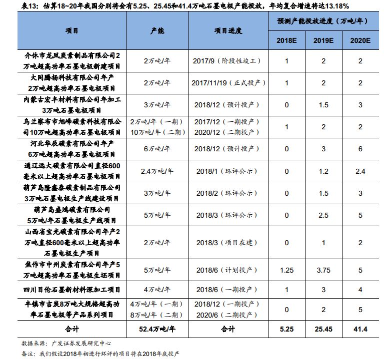 2、國內(nèi):現(xiàn)有企業(yè)或可通過優(yōu)化生產(chǎn)工序增產(chǎn),新增產(chǎn)能或至少達(dá)52.4萬噸,18~20年我國石墨電極產(chǎn)能年均復(fù)合增速或達(dá)13.18%
