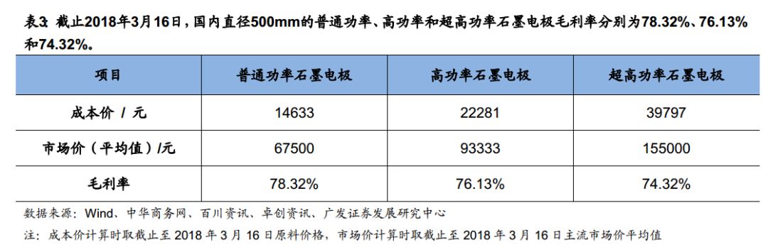 其中,CPC、CNC、CCT分別為石油焦、針狀焦和煤瀝青每噸單價(jià)。根據(jù)wind、卓創(chuàng)資訊數(shù)據(jù),截止2018年3月16日,撫順石化二廠1#A石油焦、錦州石化油系針狀焦、華東地區(qū)煤瀝青單價(jià)分別為8500元/噸、25000元/噸、3850元/噸,則計(jì)算可得普通功率、高功率和超高功率石墨電極成本分別為14633元/噸、22281元/噸、39797元/噸;根據(jù)中華商務(wù)網(wǎng)數(shù)據(jù),截至2018年3月16日,國內(nèi)直徑500mm的普通功率、高功率和超高功率石墨電極主流市場(chǎng)價(jià)分別為67500元/噸、93333元/噸,155000元/噸,毛利率分別為78.32%、76.13%和74.32%。