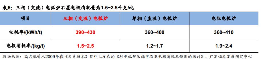 石墨電極是易耗品,不同類型電弧爐石墨電極消耗量在1.2~2.5 kg/t之間,受多因素影響而不同。根據(jù)B.Bowman等人在《炭素技術(shù)》期刊上發(fā)表的《電弧爐中石墨電極的消耗》一文,石墨電極消耗方式可分為端部消耗、側(cè)面氧化消耗、殘端損失以及根部折斷四種方式;石墨電極其消耗量及消耗速度受電爐電流大小、生產(chǎn)能力、實(shí)際氧量、實(shí)際連接、廢鋼種類和裝料方式等多方面的影響。根據(jù)高占彪等人2009年在《炭素技術(shù)》期刊上發(fā)表的《對(duì)電弧爐冶煉中石墨電極消耗及使用的探討》一文,電弧爐噸鋼石墨電極消耗在1.2kg/t至2.5kg/t之間;不同類型的電弧爐其石墨電極消耗量也不同,直流電爐石墨電極消耗量相比交流電爐和電阻電爐偏低。