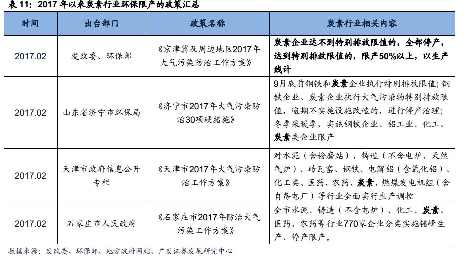 京津冀及周邊地區(qū)對(duì)石墨炭素企業(yè)關(guān)停限產(chǎn),壓制石墨炭素企業(yè)產(chǎn)能、產(chǎn)量釋放。根據(jù)中國炭素行業(yè)協(xié)會(huì)統(tǒng)計(jì)數(shù)據(jù),河南、山東和湖南列全國石墨及炭素制品產(chǎn)量排名前三位,占比分別為29%、19%和7.95%;河南、山東、山西、河北、天津和北京等京津冀及周邊地區(qū)石墨和炭素制品產(chǎn)量就占全國總產(chǎn)量的54%左右;2017年2月,發(fā)改委、環(huán)保部聯(lián)合北京市、天津市、河北省、河南省、山東省和山西省人民政府,發(fā)布了《京津冀及周邊地區(qū)2017年大氣污染防治工作方案》,規(guī)定“炭素企業(yè)達(dá)不到特別排放限值的,全部停產(chǎn),達(dá)到特別排放限值的,限產(chǎn)50%以上,以生產(chǎn)線計(jì)”。石家莊市、濟(jì)寧市、天津市等地市也相繼發(fā)布了炭素行業(yè)環(huán)保限產(chǎn)、停產(chǎn)要求。