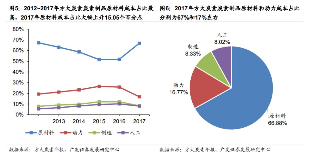 石墨電極的原料成本和動(dòng)力成本為主要成本,占比達(dá)83.65%。根據(jù)中國炭素行業(yè)協(xié)會(huì)統(tǒng)計(jì)數(shù)據(jù),2017年方大炭素的石墨電極產(chǎn)量居全國首位。方大炭素的炭素制品營(yíng)業(yè)收入占公司總營(yíng)收的75%,石墨電極產(chǎn)量占當(dāng)年公司炭素制品總產(chǎn)量的85%,因此我們以典型石墨電極生產(chǎn)企業(yè)——方大炭素的2017年炭素制品成本構(gòu)成作為石墨電極的成本構(gòu)成是合理的。根據(jù)方大炭素2017年年報(bào),炭素制品的成本構(gòu)成中,原料成本、動(dòng)力成本、人力成本和制造成本分別占66.88%、16.77%、8.02%和8.33%,其中原料成本相比2016年的51.83%大幅上升15個(gè)百分點(diǎn)。