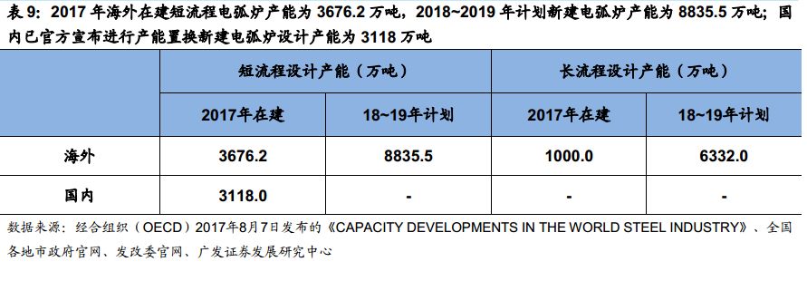 根據(jù)我們于2018年3月6日發(fā)布的《煉鋼工藝發(fā)展路徑專題之一:短流程VS長(zhǎng)流程-環(huán)保與經(jīng)濟(jì)性加速短流程發(fā)展,上游原材料及耗材產(chǎn)業(yè)鏈或受益》深度報(bào)告,經(jīng)合組織(OECD)于2017年8月7日發(fā)布的《CAPACITYDEVELOPMENTS IN THE WORLD STEEL INDUSTRY》(全球鋼鐵工業(yè)產(chǎn)能發(fā)展)報(bào)告統(tǒng)計(jì)了2017年海外在建短流程電弧爐產(chǎn)能為3676.2萬噸,2018~2019年計(jì)劃新建電弧爐產(chǎn)能為8835.5萬噸;國內(nèi)已官方宣布進(jìn)行產(chǎn)能置換需淘汰的煉鋼產(chǎn)能共計(jì)4059萬噸,其中電爐煉鋼產(chǎn)能2010萬噸,高爐-轉(zhuǎn)爐煉鋼產(chǎn)能2049萬噸;產(chǎn)能置換新建電弧爐設(shè)計(jì)產(chǎn)能為3118萬噸。