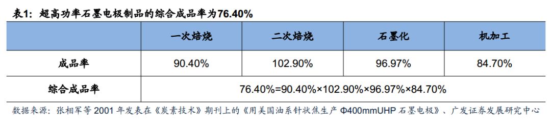 1噸成品石墨電極需1.02噸原料和0.29噸粘結(jié)劑。根據(jù)2009年大連理工大學(xué)高勃碩士學(xué)位論文《國產(chǎn)針狀焦生產(chǎn)超高功率石墨電極的研究》,石墨電極骨料為石油焦和針狀焦,粘結(jié)劑為煤瀝青,其基礎(chǔ)配方為78%的骨料和22%的粘結(jié)劑。而根據(jù)張向軍等人2001年發(fā)表在《炭素技術(shù)》期刊上的《用美國油系針狀焦生產(chǎn)Φ400mmUHP石墨電極》一文,石墨電極在焙燒、石墨化等工序中會(huì)由于添加劑揮發(fā)或增加造成質(zhì)量變化,在機(jī)加工等工序中會(huì)發(fā)生加工損失,其一次焙燒、浸漬、二次焙燒、石墨化和機(jī)加工成品率分別為90.4%、102.9%、96.97%、84.70%,因此其綜合成品率為76.40%。即1噸成品石墨電極需最初原材料質(zhì)量為1.31噸,對(duì)應(yīng)骨料和粘結(jié)劑質(zhì)量分別為1.02噸和0.29噸。