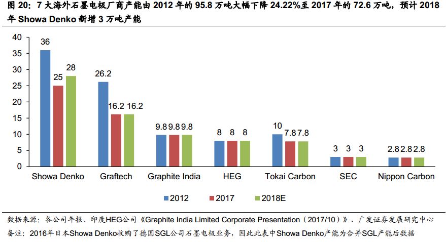 合并、去產(chǎn)能,7大海外石墨電極廠商產(chǎn)能由2012年的95.8萬噸大幅下降24.22%至2017年的72.6萬噸。根據(jù)印度石墨電極巨頭Graphite IndiaLimited于2017年10月發(fā)布的《Graphite India Limited Corporate Presentation(2017/10)》,受制于行業(yè)景氣度降低、利潤(rùn)下降等影響,海外石墨巨頭自2012年以來進(jìn)行了多次減產(chǎn)、合并。德國SGL公司于2016年10月份將石墨電極業(yè)務(wù)出售給了日本的Showa Denko,后者也成為海外最大的石墨電極廠商,2017年其產(chǎn)能為25萬噸,僅為2012年的69.44%;產(chǎn)能排名第二位的美國Graftech公司2017年產(chǎn)能為16.2萬噸,僅為2012年的61.83%;印度Graphite India、HEG、日本SEC和Nippon Carbon則基本沒有去產(chǎn)能。綜合來看,7家海外石墨電極廠商產(chǎn)能由2012年的95.8萬噸大幅下降24.22%至2017年的72.6萬噸。