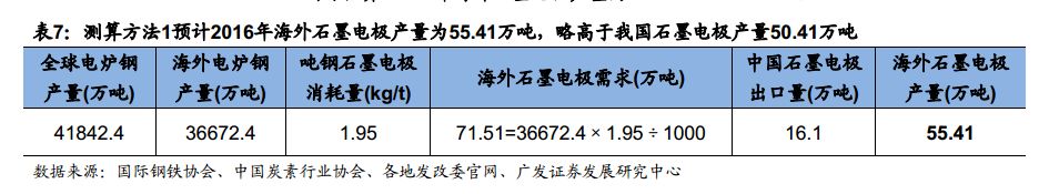 方法1:根據(jù)國際鋼鐵協(xié)會(huì)統(tǒng)計(jì)數(shù)據(jù),2016年全球電爐鋼產(chǎn)量為41842.4萬噸,扣除中國5170萬噸,則2016年海外電爐鋼產(chǎn)量為36672.4萬噸。若按前文所述,煉鋼用石墨電極平均消耗量為1.95kg/t計(jì)算,2016年海外電弧爐石墨電極需求量為71.51萬噸。根據(jù)中國炭素行業(yè)協(xié)會(huì)統(tǒng)計(jì)數(shù)據(jù),2016年我國石墨電極出口16.1萬噸,則可估算2016年海外石墨電極產(chǎn)量為55.41=71.51-16.1萬噸。