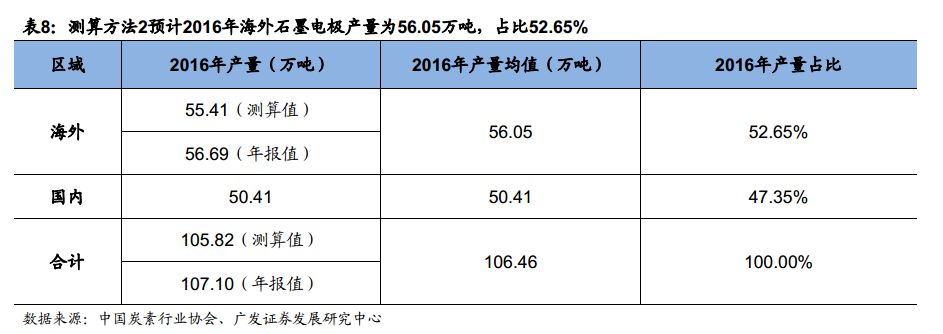 若要得到海外石墨電極表觀消費(fèi)量,則需首先確定海外石墨電極產(chǎn)量。根據(jù)我們于2018年3月17日發(fā)布的《煉鋼工藝發(fā)展路徑專題之二:短流程發(fā)展箭在弦上?--政策、環(huán)保帶來機(jī)遇,人才、技術(shù)仍有挑戰(zhàn),提高廢鋼回收率是關(guān)鍵前提》深度報(bào)告,我們采取兩種方法對(duì)海外石墨電極進(jìn)行測(cè)算并相互驗(yàn)證,得到2016年海外石墨電極產(chǎn)量預(yù)計(jì)為56.05萬噸。