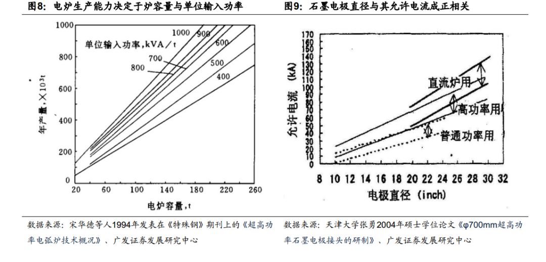 超高功率電弧爐發(fā)展驅(qū)動(dòng)超高功率石墨電極需求。隨著勞動(dòng)效率高、綜合成本低的大容量超高功率電弧爐的日趨增多,對(duì)電弧爐用石墨電極的最大允許電流也提出了更高的要求。根據(jù)天津大學(xué)張勇2004年碩士學(xué)位論文《φ700mm超高功率石墨電極接頭的研制》,電弧爐用石墨電極最大允許電流與石墨電極的直徑成正相關(guān)。因此為滿足超高功率電弧爐的使用工況,發(fā)展大直徑的石墨電極勢(shì)在必行。