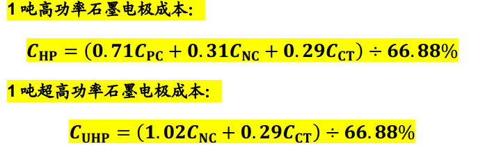 石墨電極生產(chǎn)成本受原材料價(jià)格影響較大。根據(jù)前文,石墨電極生產(chǎn)成本中原材料成本約占66.88%。盡管生產(chǎn)超高功率石墨電極所需針狀焦成本要高于普通功率和高功率石墨電極,但超高功率石墨電極由于生產(chǎn)工序更多、加工精度要求更高,相應(yīng)人力成本、制造成本和動(dòng)力成本也會(huì)更高,因此我們假設(shè)普通功率、高功率和超高功率石墨電極原材料成本占比均為66.88%也是合理的。因此我們可以得到普通功率、高功率和超高功率石墨電極生產(chǎn)成本計(jì)算方法: