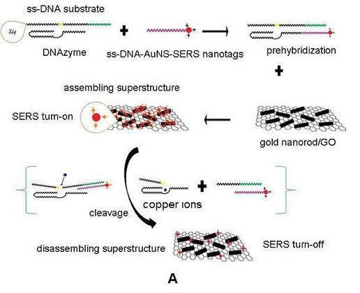 研究人員選取了高純度均一分散性的金納米棒/石墨烯復合材料,設計了金屬銅離子專一識別的核酸適配體,利用核酸適配體作為介導物質,通過納米點與束縛在石墨烯表面金納米棒的高效結合,從而形成石墨烯表面的等離激元納米棒/納米點超結構顆粒。由于銅離子的介入,雜交配對的核酸適配體會發(fā)生裂解,導致石墨烯表面的等離激元納米棒/納米點超結構顆粒的解離,從而實現(xiàn)了金納米棒/納米點/石墨烯超結構材料的可逆化組裝。