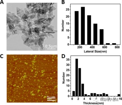 圖3.石墨烯片層微觀形態的分析:(A)石墨烯的TEM圖像;(B)石墨烯片層橫向尺寸的統計;(C)石墨烯的AFM圖像;(D)石墨烯片層的高度統計