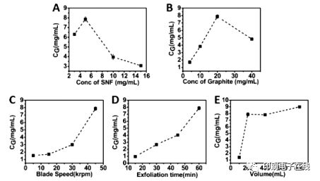 圖2. 石墨烯濃度與不同影響因素之間的關系:(A)絲蛋白納米線的濃度(B)石墨的濃度(C)轉速(D)剝離時間(E)體積