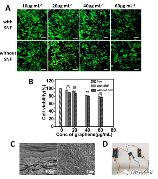 圖4. (A)與石墨烯共培養24h后的細胞熒光圖像,標尺=150μm;(B)細胞與石墨烯共培養24h的CCK-8結果;(C)石墨烯涂覆的紙的截面和表面SEM圖像;(D)通過發光二極管驗證的石墨烯的導電性