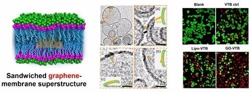 墨烯-生物膜“三明治”超級結構及其在藥物遞送中的潛在應用。(左)模擬圖;(中)冷凍透射照片;(右)膜間遞送藥物(GO-VTB)的優勢結果