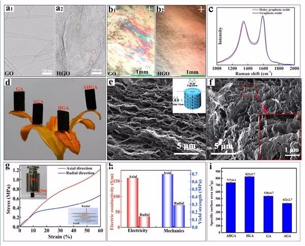 圖:各向異性“孔洞石墨烯”氣凝膠基本表征:氧化石墨烯片層的透射電鏡照片(a1)及氧化石墨烯液晶的偏光顯微鏡照片(b1),孔洞氧化石墨烯片層的透射電鏡照片(a2)及氧化石墨烯液晶的偏光顯微鏡照片(b2),氧化石墨烯及孔洞氧化石墨烯片層的拉曼光譜(c),各向異性“孔洞石墨烯”氣凝膠的光學照片(d)、掃描電鏡照片(e,f)、力學(g)、電學(h)及比表面積數據(i)。