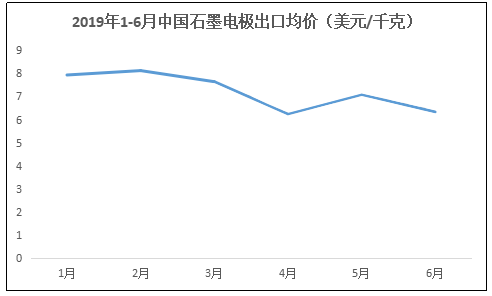 在國內價格大幅走跌的情況下 ,大家紛紛將目光瞄準了出口市場,由1-6月國內石墨電極出口均價可以看出,盡管整體呈現下跌趨勢,最低谷出現在4月,為6.24美元/千克,但仍高于同期國內平均價格。