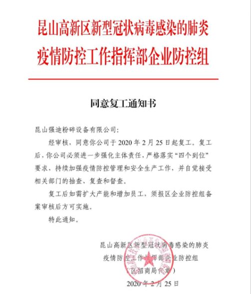 復工是新的開始,我們將啟用更為嚴格的防控措施,在確保所有員工安全健康的前提下,盡量趕定單交期,為客戶提供高品質、高性能、高性價比的粉碎、分級、研磨設備!