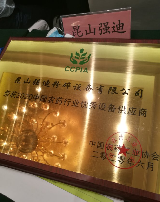 2020年6月12日,由中國農藥工業協會主辦的“金旺論壇”第五屆中國農藥行業供應鏈和采購管理研討會暨中國農藥行業供應鏈和采購管理工作委員會擴大會議在江蘇常州拉開帷幕。昆山強迪粉碎設備有限公司(以下簡稱“強迪粉碎”)榮獲“2020中國農藥行業優秀設備供應商”稱號,是公司多年堅持“以質量求生存,以創新求發展,以客戶需要為依據,以合作共贏為結果”企業宗旨的最好見證。