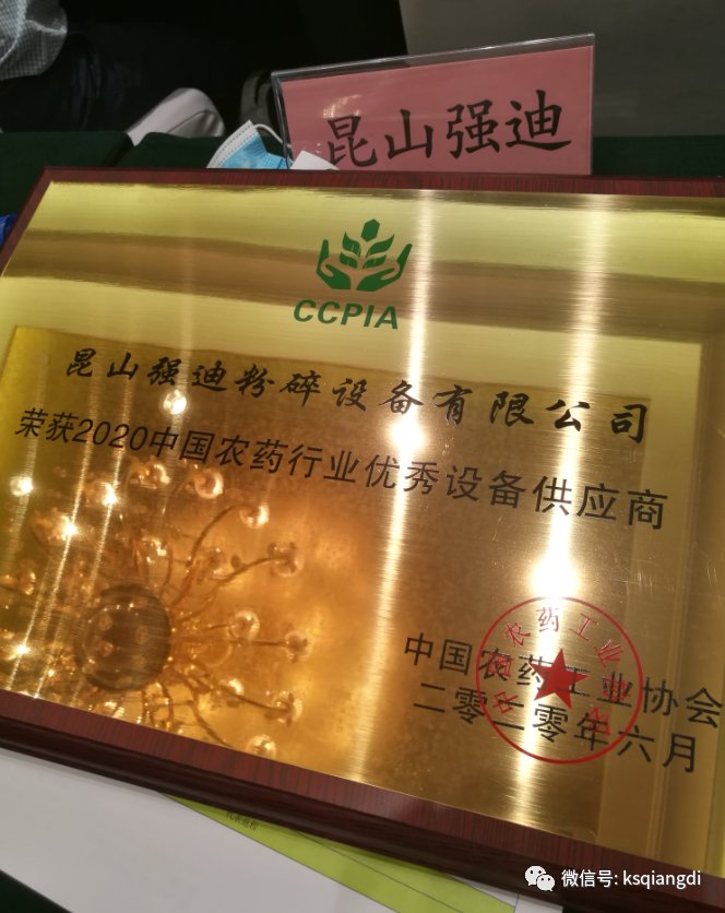“2020年6月12日,由中國農藥工業協會主辦的“金旺論壇”第五屆中國農藥行業供應鏈和采購管理研討會暨中國農藥行業供應鏈和采購管理工作委員會擴大會議在江蘇常州拉開帷幕。昆山強迪粉碎設備有限公司(以下簡稱“強迪粉碎”)榮獲“2020中國農藥行業優秀設備供應商”稱號。